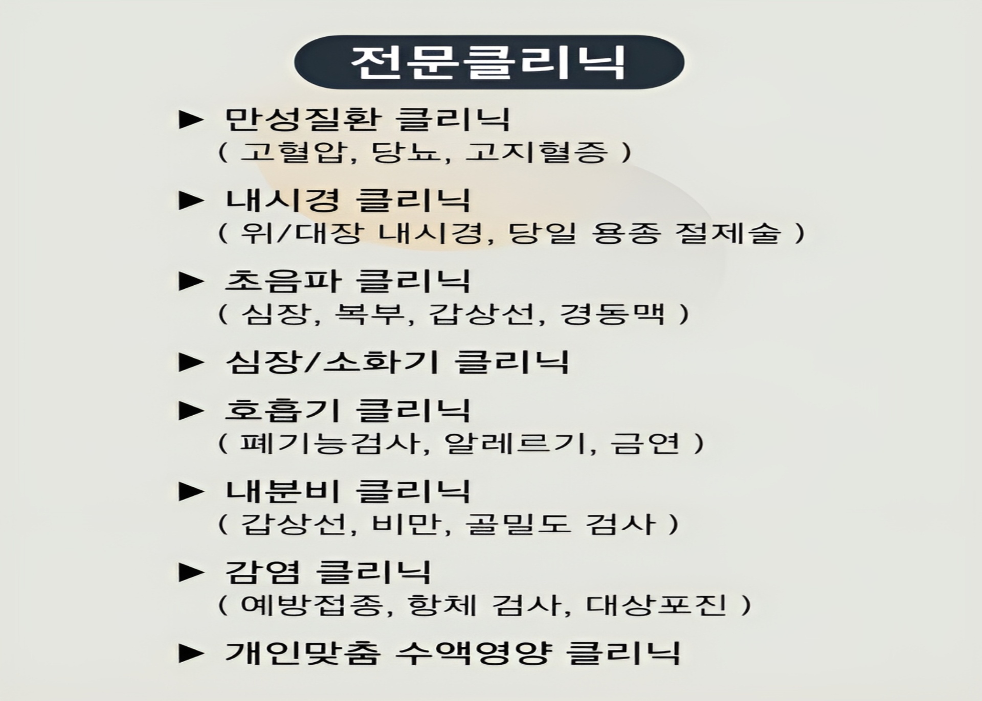 일산역 훈내과의원의 전문클리닉은 만성질환클리닉, 내시경클리닉, 초음파클리닉, 심장/소화기 클리닉 등 8가지 전문클리닉을 개인 맞춤으로 운영중에 있습니다.